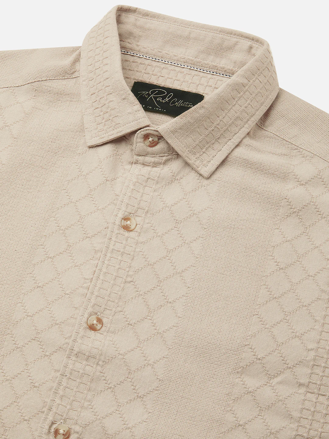 Crafted for both comfort and style, this shirt by VASTRADO'S RAD COLLECTION is woven from soft and breathable cotton. The warm bisque beige hue complements every skin tone, while the intricate embroidery, adds a layer of elegance that catches the eye without being loud. Turn heads and spark conversation with this distinctive design, perfect for dressing up with chinos and loafers or keeping it casual with jeans and sneakers.