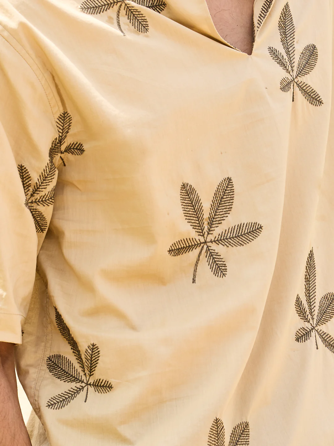 Coastal Breeze Palm Leaf Embroidered Khaki Oversized Polo Shirt