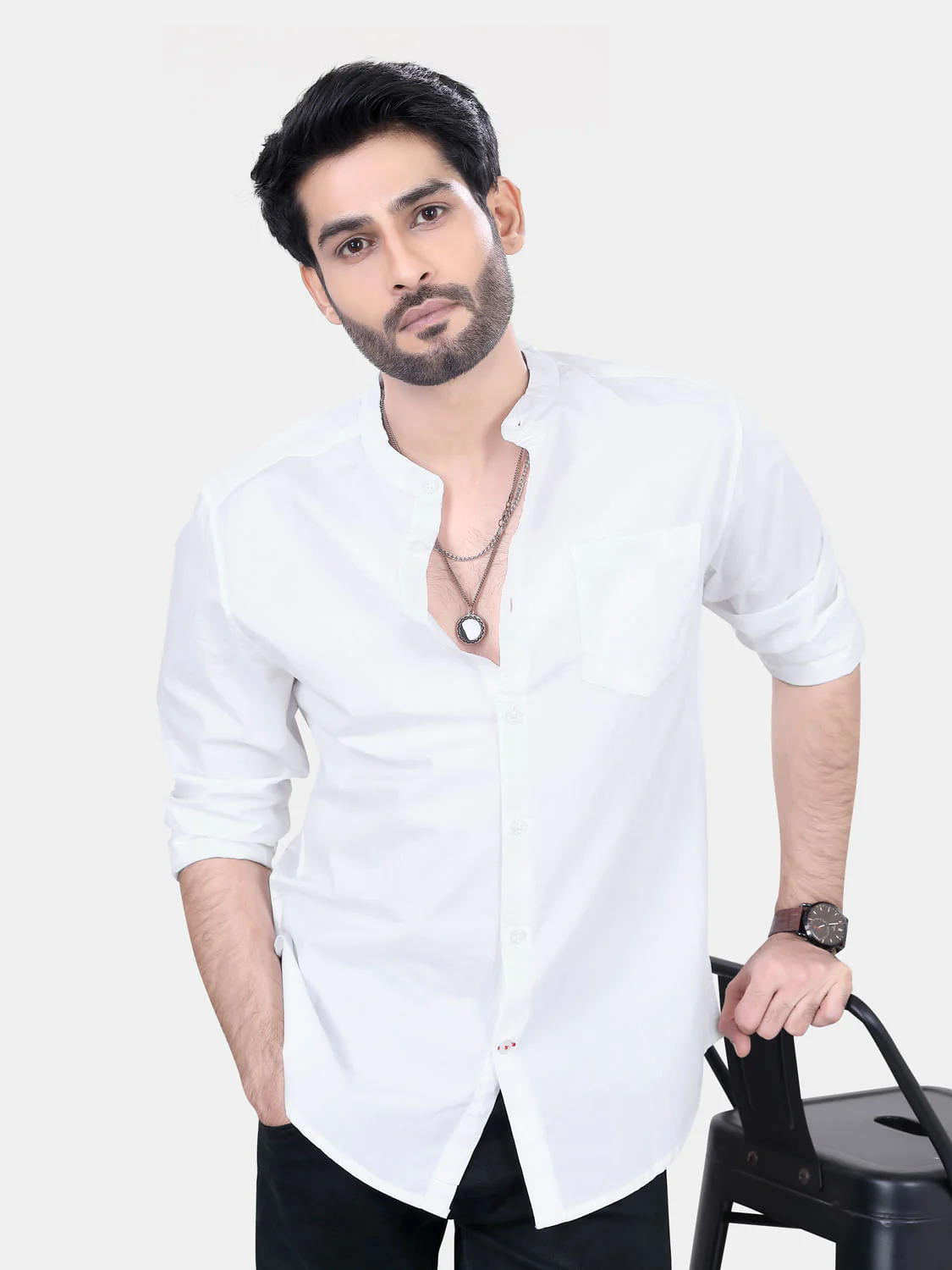 Mandarin Collar White Solid Shirt