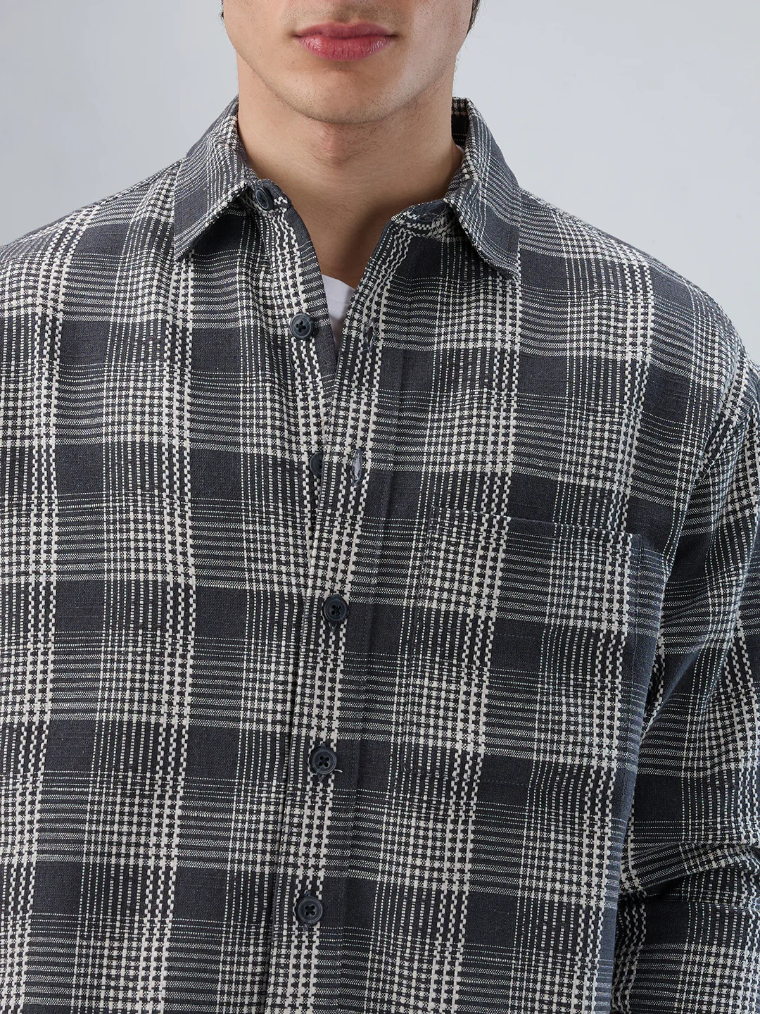 This Monochrome Dense Contrast Checks Boxy Fit Crop Shirt makes a bold statement with sharp black-and-white check pattern and a contemporary cropped silhouette. Designed with a relaxed, boxy fit for effortless comfort, it pairs seamlessly with our bottoms or demins. Lightweight yet structured, it adds versatile style to everyday streetwear. A modern essential for bold, casual looks.