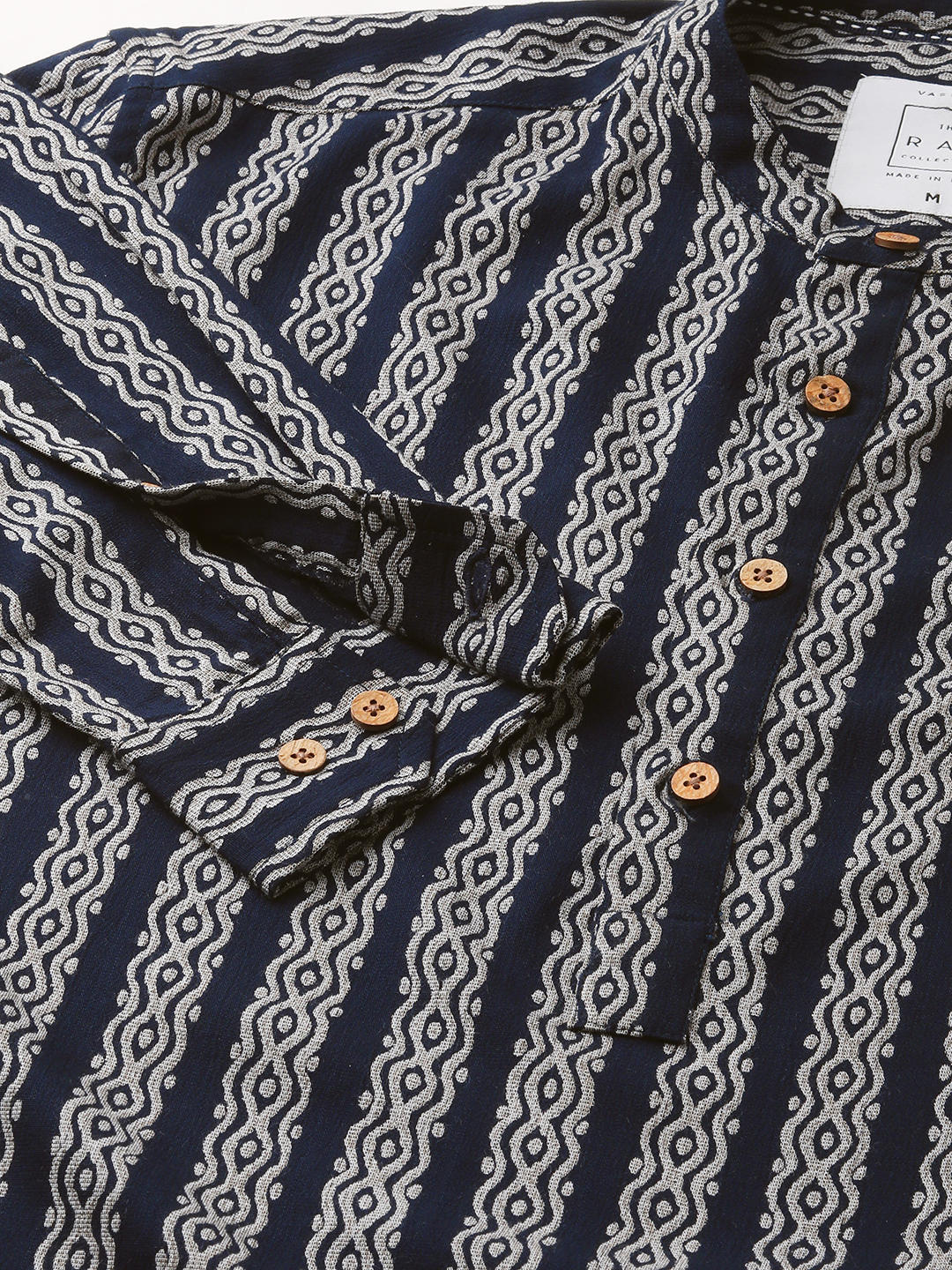 This Navy & Golden Ethnic Motifs Printed Kurta dazzles with its striking contrast of deep blue and golden motifs. The intricate ethnic patterns add a touch of elegance, while the mandarin collar enhances its refined appeal. Perfect for making a bold statement at any festive or special occasion.