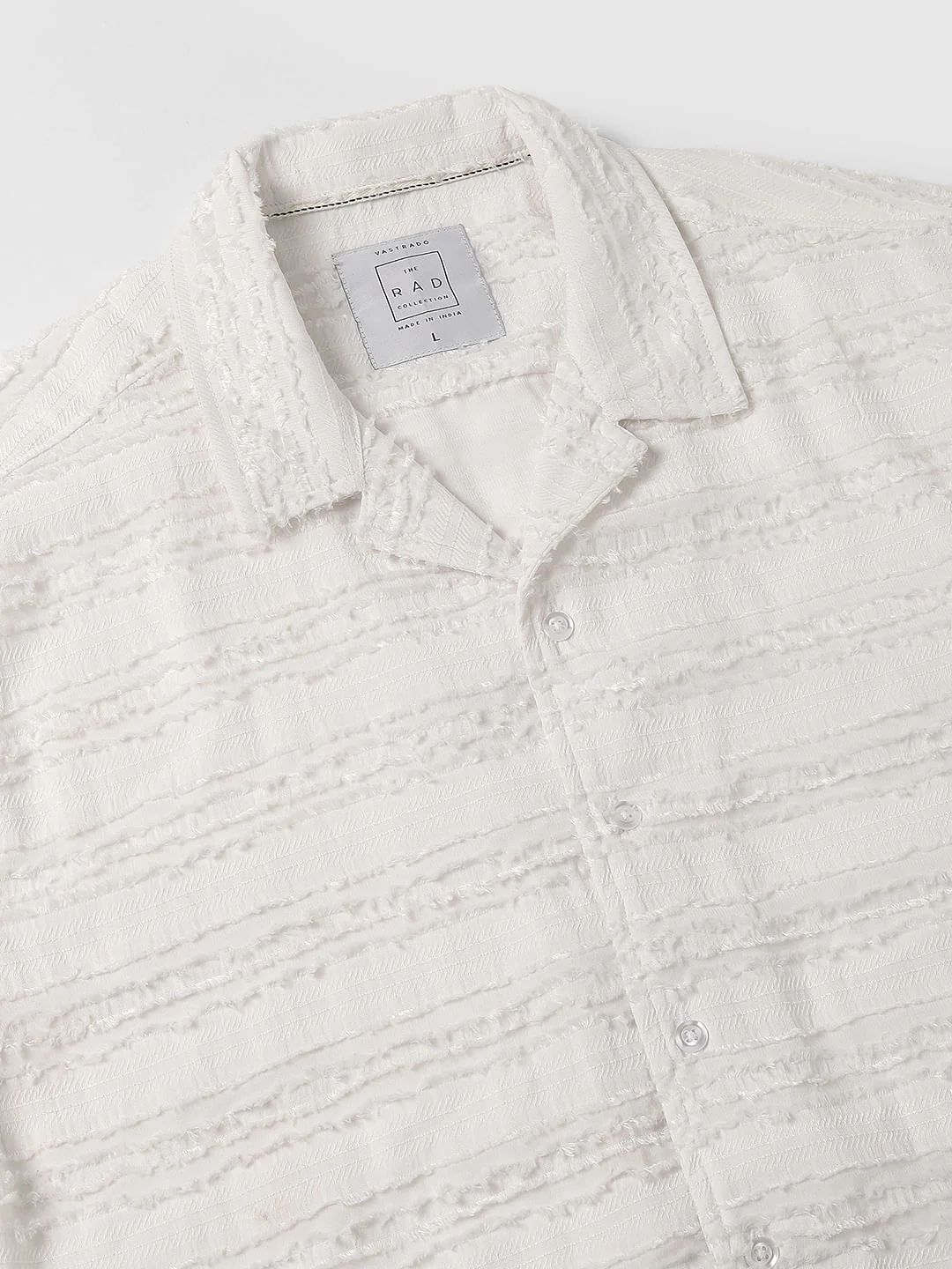 Introducing our Snow White Textured Frayed Oversized Shirt from Vastrado's RAD Collection, a delicate fusion of elegance and charm. This shirt features a striped pattern with half sleeves, frayed pattern and a Notch Collar. Perfect for both casual outings and special occasions, its understated beauty effortlessly elevates any ensemble. Embrace timeless style with this versatile shirt that exudes grace and refinement.