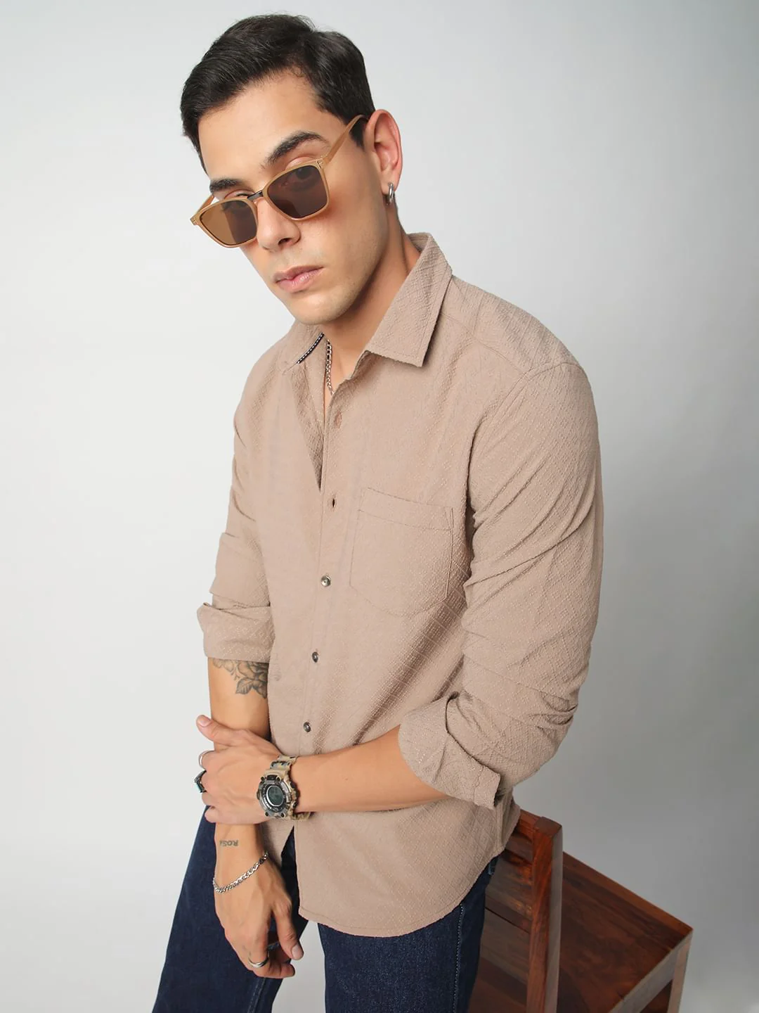 Taupe Beige Lozenge Jacquard Textured Shirt
