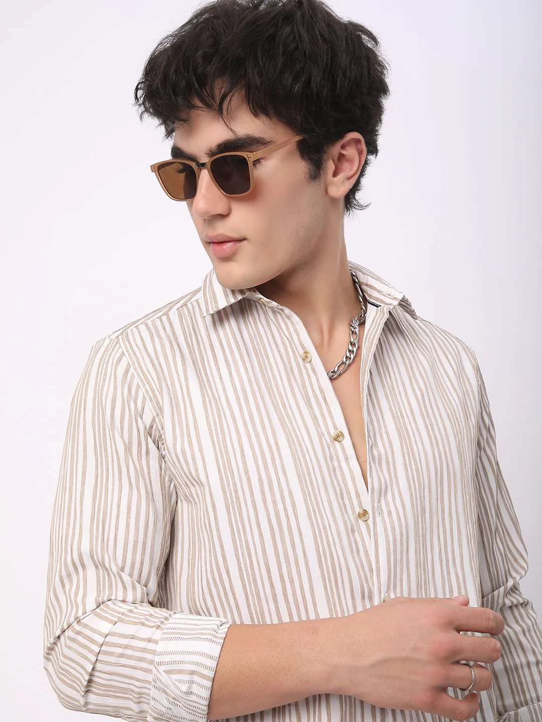 Add a touch of subtle sophistication to your wardrobe with this classic white & beige striped shirt by VASTRADO. The soft beige hue is enhanced by delicate shadow stripes, creating a refined and understated pattern. Ideal for both casual and smart-casual settings, this shirt combines elegance with versatility. Its timeless design ensures it pairs effortlessly with various outfits, making it a versatile staple for any stylish wardrobe.