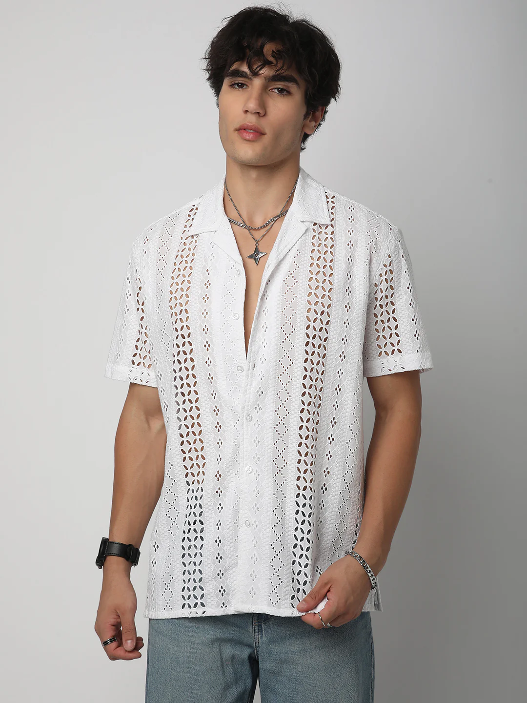 This White Floral Schiffli Notch Collar Oversized Shirt is a delightful blend of elegance and comfort. Crafted from soft cotton, it showcases beautiful floral schiffli embroidery that adds a touch of sophistication to its pristine white base. The notch collar and half sleeves lend a contemporary flair, while the oversized fit ensures a relaxed silhouette. Perfect for casual outings or stylish layering, this shirt is a versatile addition to any wardrobe.