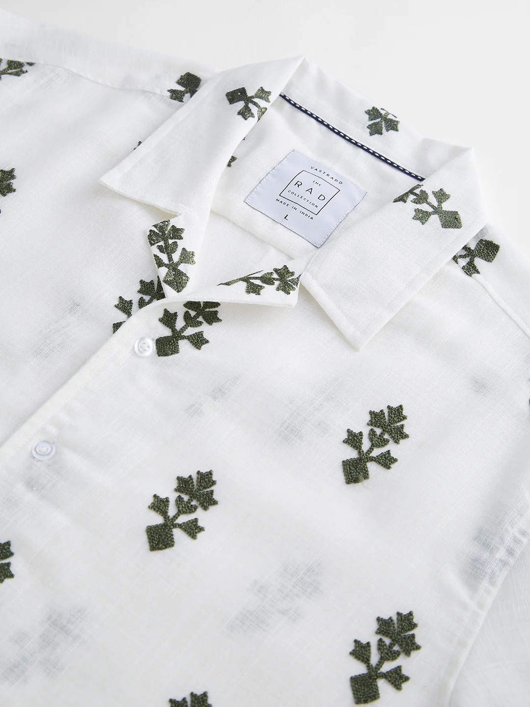 White & Olive Embroidered Notch Collar Oversized Shirt